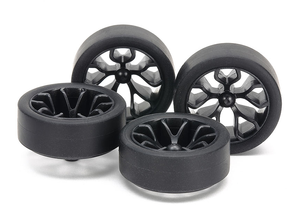 【 マシンの性能アップやセッティングに役立つパーツです 】 ディッシュデザインのカーボン強化ホイールと、ハード小径ローハイトタイヤ(26mm)を4本ずつ、1台分セットされています。カーボンファイバー配合樹脂製のホイールは強度が高く、跳ねにくさも特徴で、タイヤはキット標準タイプに比べて硬く、ローグリップのため、コーナリング時にスピードが落ちにくく、ジャンプの後の着地でもマシンが跳ねにくくなります。カラーはタイヤがグレイ、ホイールは精悍なブラックとなっています。小径タイヤを装着したスーパーX、スーパーXX、FM-Aシャーシ採用のミニ四駆各車に使えます。★硬いタイヤのため、強く押し込んで装着します。