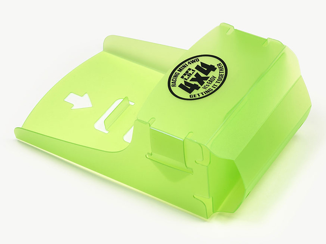 【 走行中のマシンを安全確実にキャッチ 】 接着剤やビスを使わずに簡単に組み立てられ、コースを走行しているミニ四駆を安全にキャッチできるツールです。厚さ0.75mmのPP(ポリプロピレン)材を折り曲げて組み立てます。底面に小さな3つのリブを立てマシンを減速させるとともに、キャッチした後のタイヤロックを防止します。組み立てたミニ四駆キャッチャーはポータブルピット(下段)に収納できます。色はブラック、フルカウルミニ四駆30周年記念ロゴとタミヤマークがピンクでプリントされています。